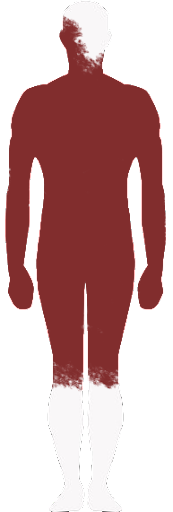 FEATURES AND ODDITIES: covering the right side of the face, the neck, both arms, hands, the entire torso, and down to the knees, his skin is covered in black plates akin to large, sharp scales that vary in size and shape (red in right image representing skin coverage). these plates grow from his skin and essentially are his skin, complete with nerve endings and a unique type of muscle tissue. these plates serve as a form of exoskeleton. at the edge of areas not yet consumed by them, dark smudges like dingy bruises can be found, as well as oozing dark blood from the tear of his skin changing to this will appear. his hands are the most noticeably inhuman part of him, permanently changed into large claws with rigid bone structure. he has a scar on the top left corner of his upper lipAPPEARANCE REFERENCES: HALF BODY / BUST / HEAD / HALF BODY + BUSTS / HALF BODY / BUST